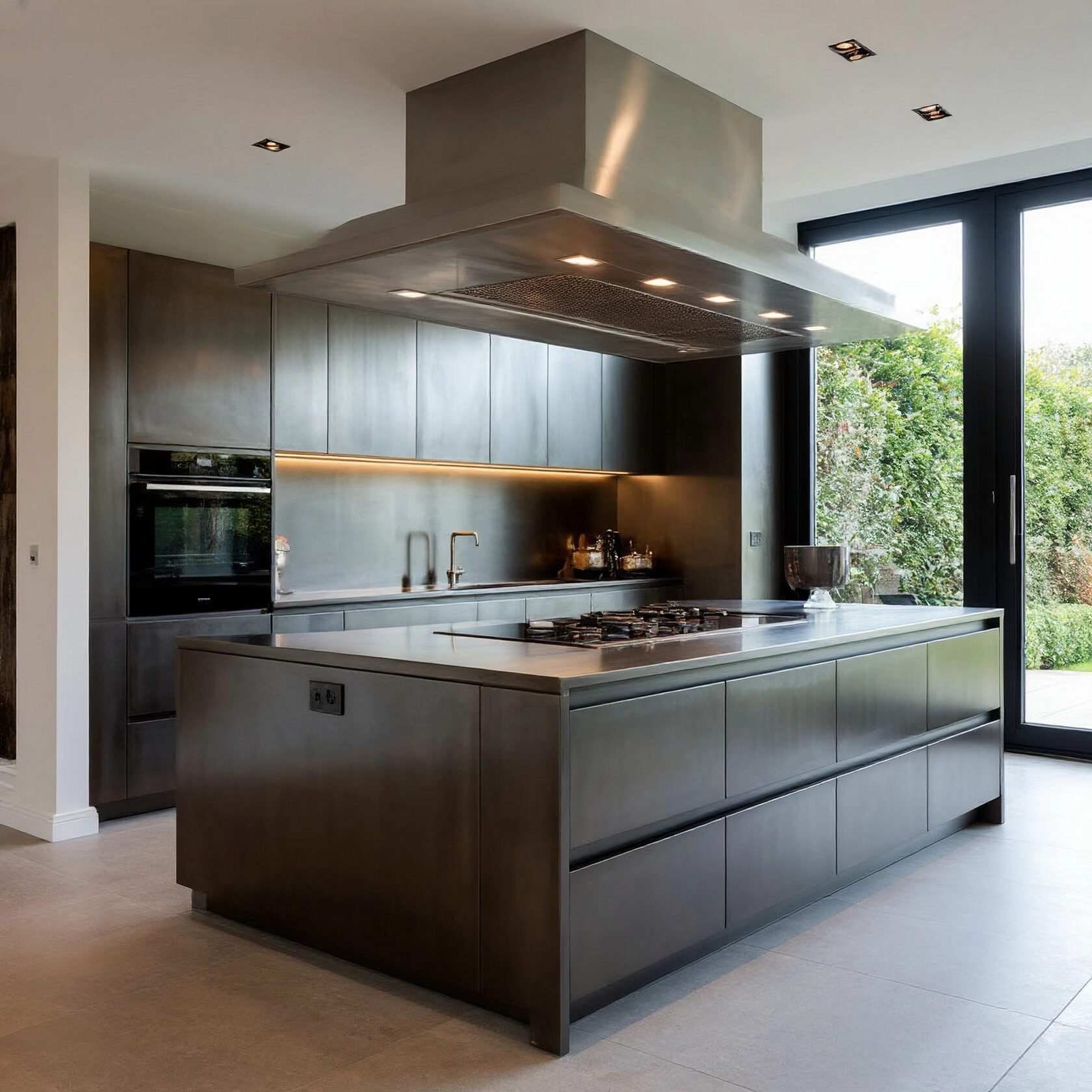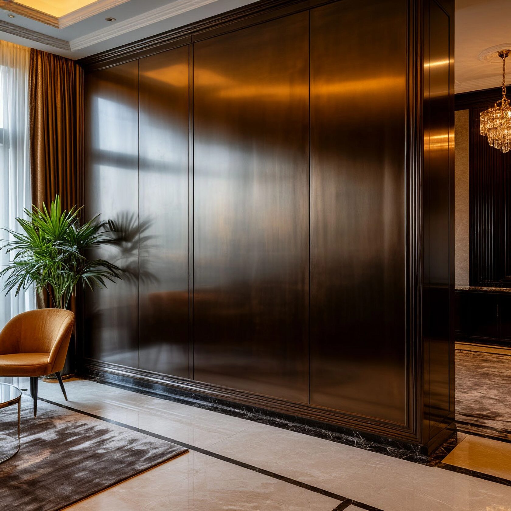 Создает матовую, бархатистую поверхность с легкой текстурой. Придает металлу современный, сдержанный и элегантный вид. Часто используется для кухонных фасадов, мебели, декоративных элементов. Скрывает мелкие дефекты и царапины, которые могут быть заметны на зеркальной поверхности.