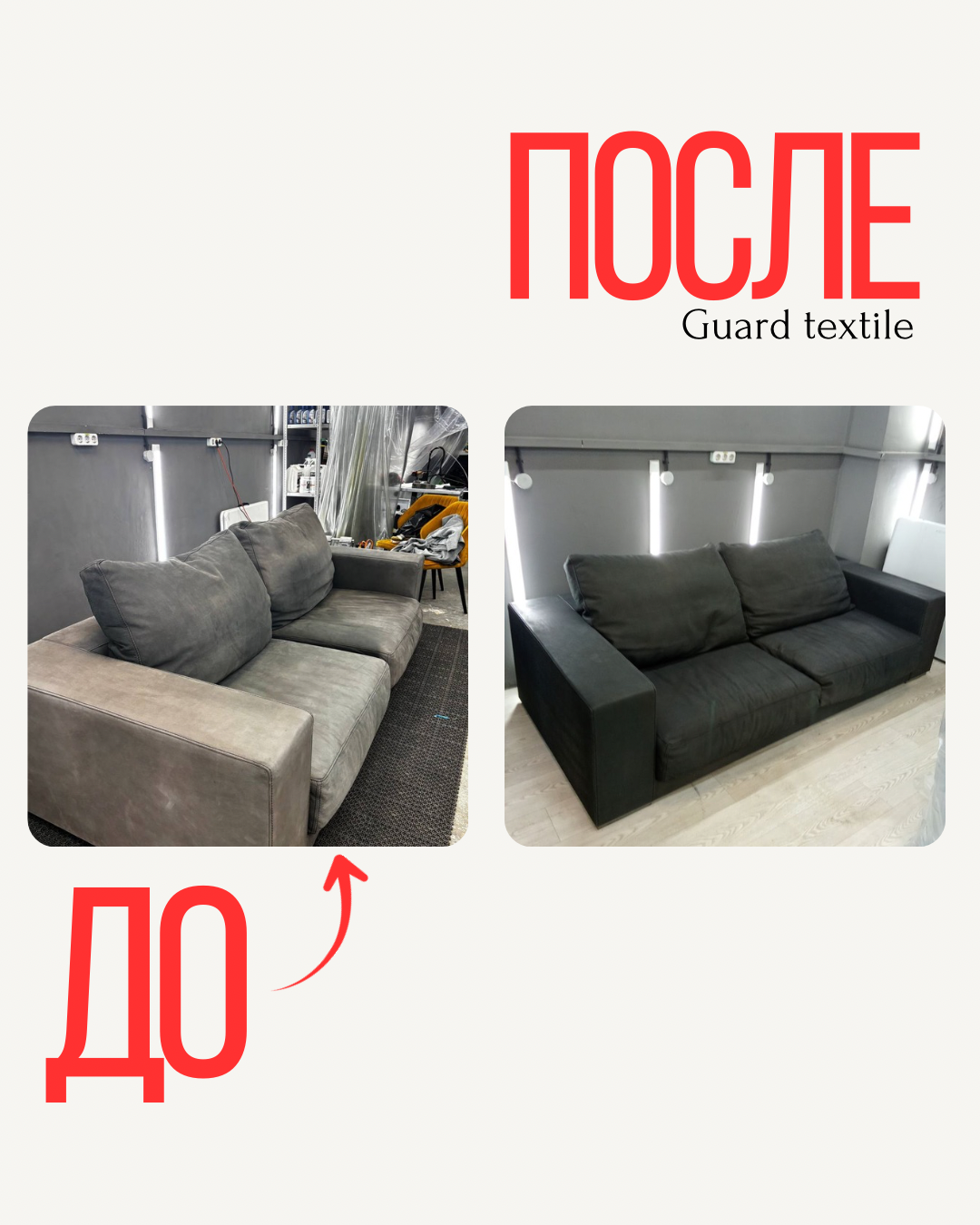 на фото "ДО" хорошо видна разница цвета обивки в местах, подверженных воздействию солнечного света и в той части, куда солнечные лучи не попадают