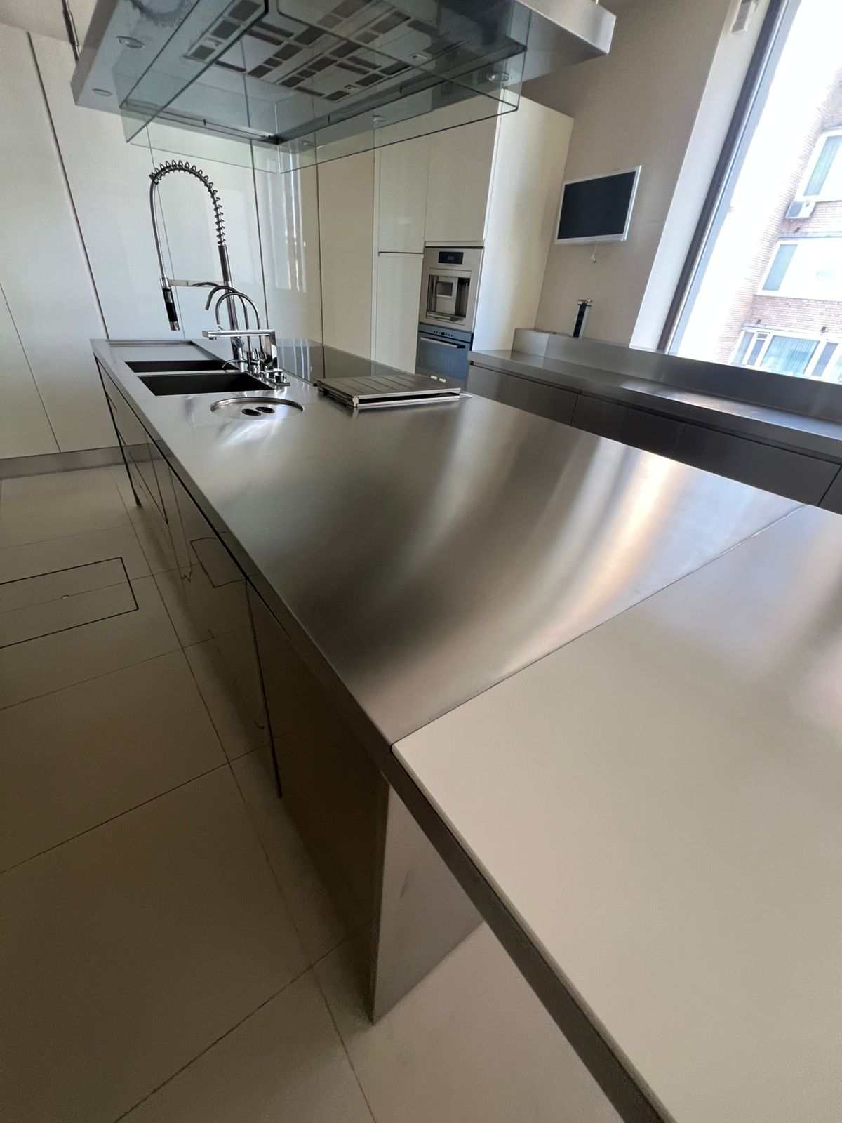 В отличие от искусственного камня или ламината, металлическая столешница спокойно выдерживает горячие кастрюли и сковороды, не оставляя следов.