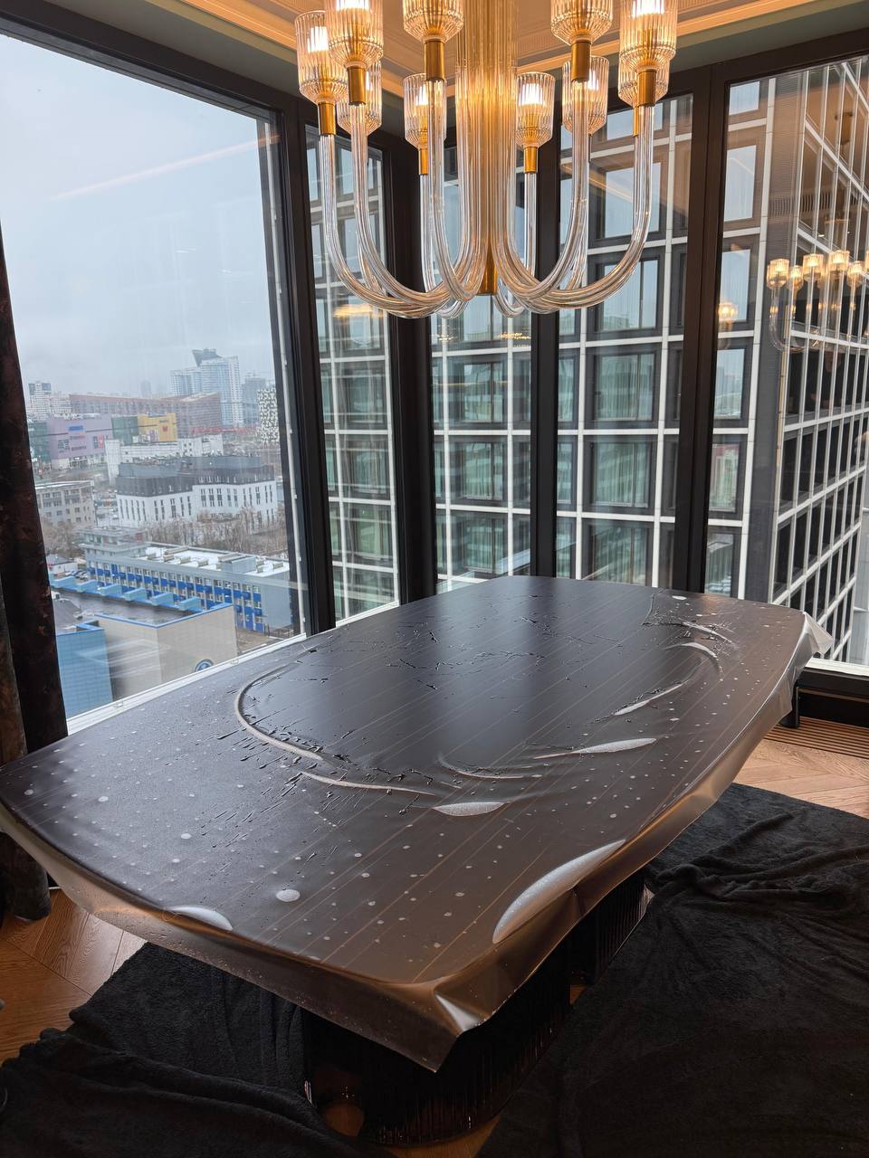 В данном проекте перед нами стояла задача защитить стол из натурального шпона от ежедневных нагрузок и при этом сохранить его благородную текстуру. Заказчик хотел минималистичный, сдержанный визуальный эффект — поэтому был выбран матовый вариант полиуретановой пленки.