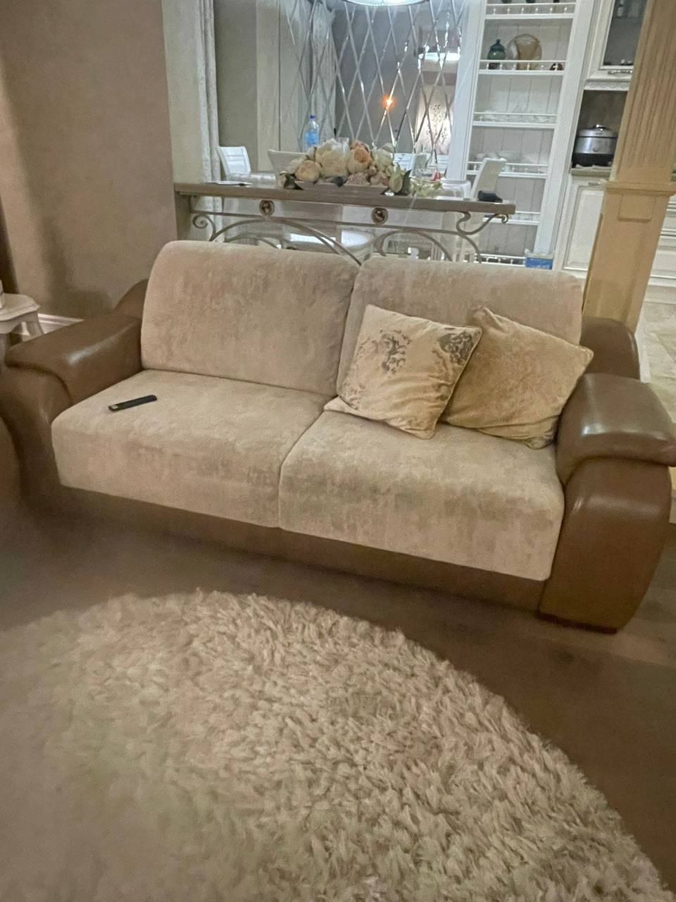 На фото выше диван Mobel&Zeit после переобивки(на самом деле мы сделали переобивку двух таких диванов - на фото видна часть второго). Мы заменили старую ткань которая уже не подлежала восстановлению от износа . Также заменили наполнитель. Казалось бы обычная работа, но все по порядку. Начнем с того в каком состоянии поступил к нам диван: