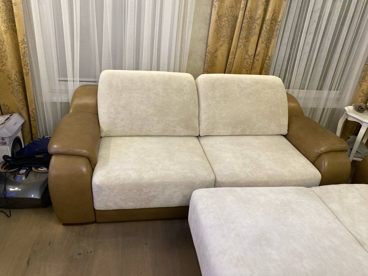 Клиент была очень довольна и заказала у нас переобивку второго такого же дивана. Н афото выше - оба дивана после выполненной работы.