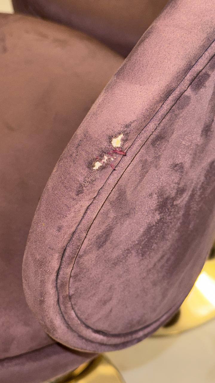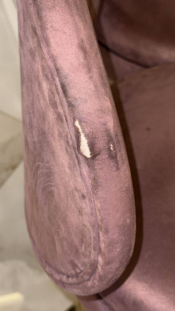 Однако у искусственной замши есть и слабые стороны. Со временем ворс вытирается, ткань может затираться, особенно на местах постоянного контакта — сиденьях и передних кромках. Именно это и произошло со стульями: материал потерял первоначальную плотность, стал "пятнистым" и местами истончился, что привело к разрывам обивки.