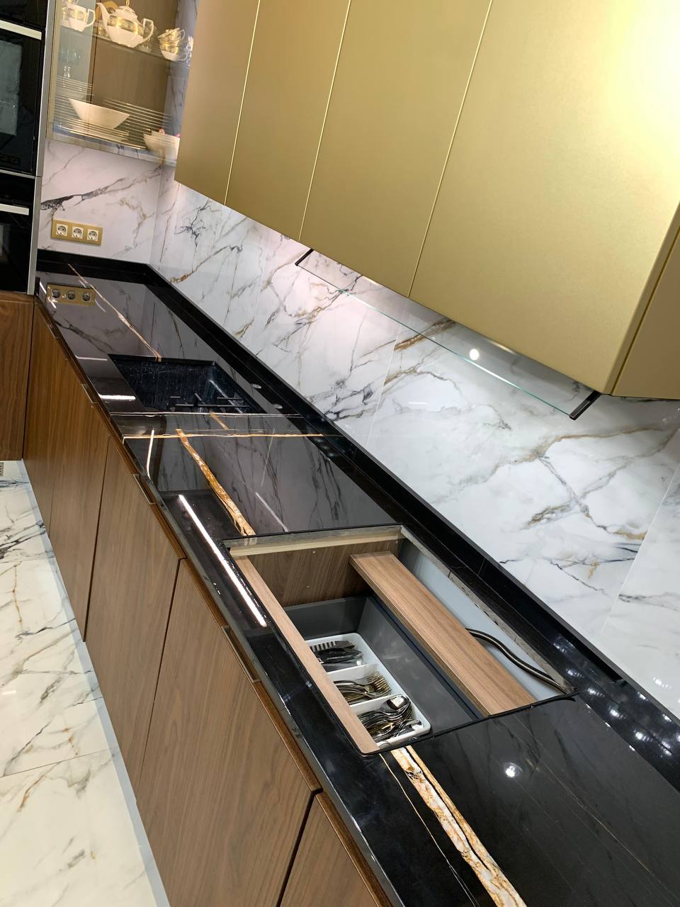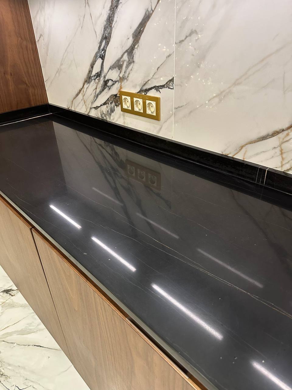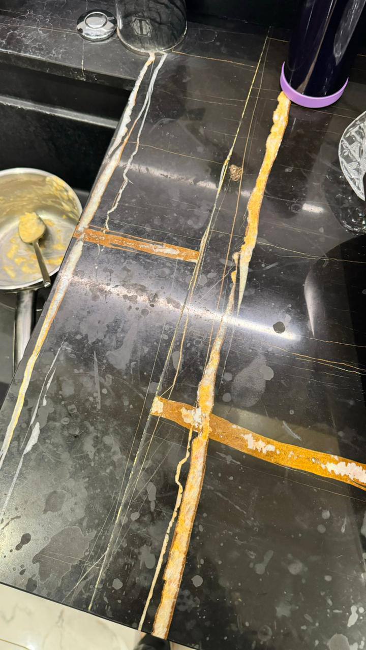 При этом, как и любой мрамор, Sahara Noir чувствителен к кислотам, высоким температурам и механическому воздействию. В условиях кухни это особенно критично: капли вина, лимонного сока, кофе или бытовой химии могут оставить матовые пятна и ожоги, а ежедневное использование приводит к появлению микроцарапин.